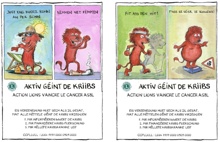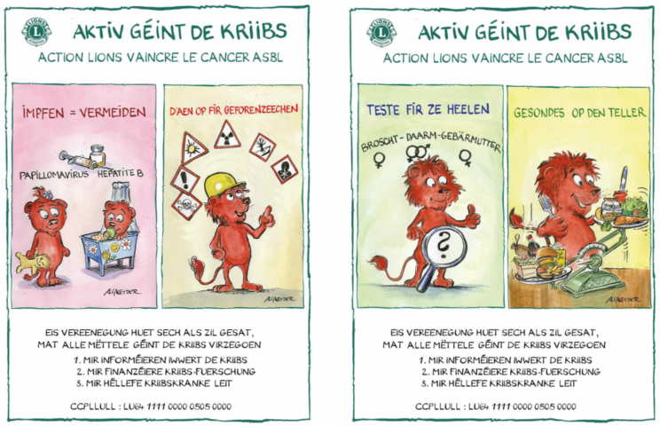 « LIONS - Tutten » (éco-sacs) est une initiative d’information et de prévention du cancer reprenant les idées de base de l’action « Europe contre le Cancer » respectivement de l’OMS. Les sacs réutilisables ont été décorés par le caricaturiste Carlo Schneider et rappellent des mesures simples à respecter en vue de la prévention du cancer. 1 500 sacs ont déjà été vendus et une 2e édition est prévue pour début 2020.